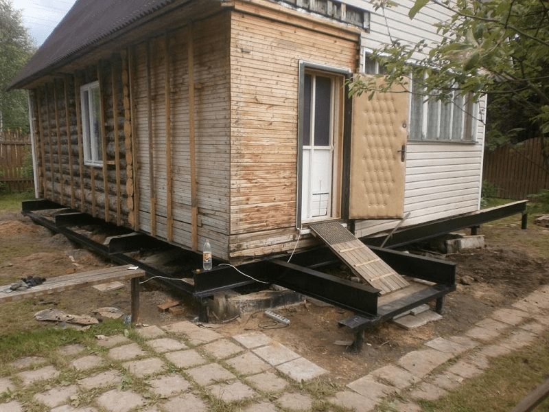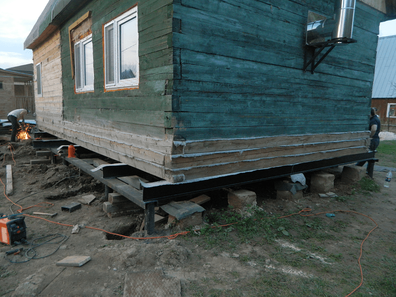 - аккуратный подъём дома на домкратах с подкладкой брусьев